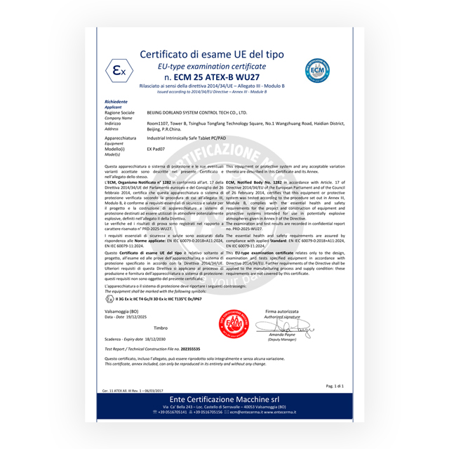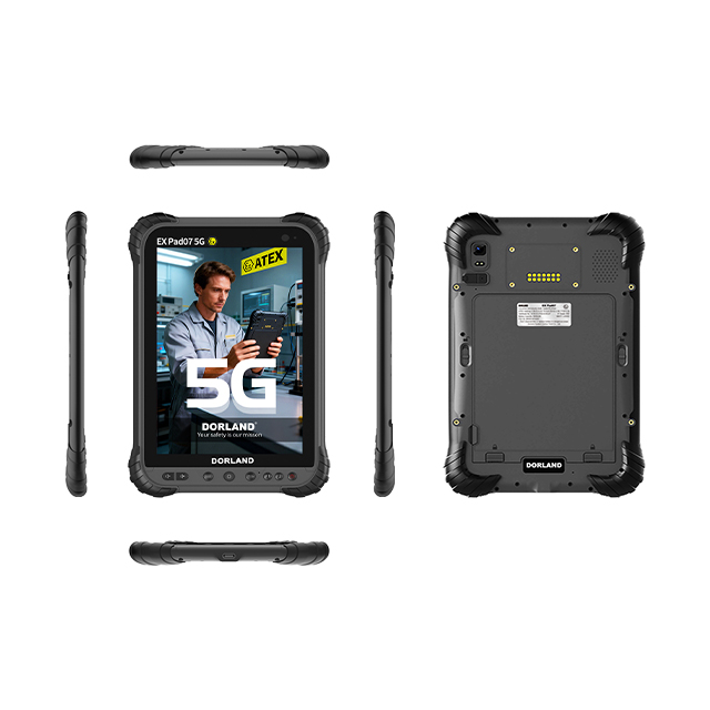 Developed by Beijing Dorland System Control Technology Co., LTD., the Industrial Intrinsically Safe Tablet PC/PAD EX Pad 07 5G (ATEX) adopted advanced technology of Germany with intrinsically safe circuit, 8.0” touch screen and 5Megapixel (Front Camera)+13Megapixel (Rear Camera with Auto Focus) camera(optional 8Megapixel (Front Camera)+16Megapixel (Rear Camera with Auto Focus) camera). Its waterproof and dustproof performance can meet the IP67 standards.